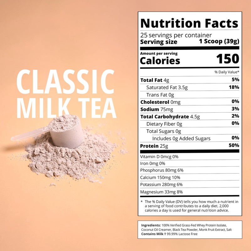 Classic Milk Tea Protein Powder | 25g Grass-Fed Whey Protein Isolate Powder | Gluten-Free & Soy-Free Bubble Tea Protein Drink | Real Ingredients & Lactose-Free | 19 Servings