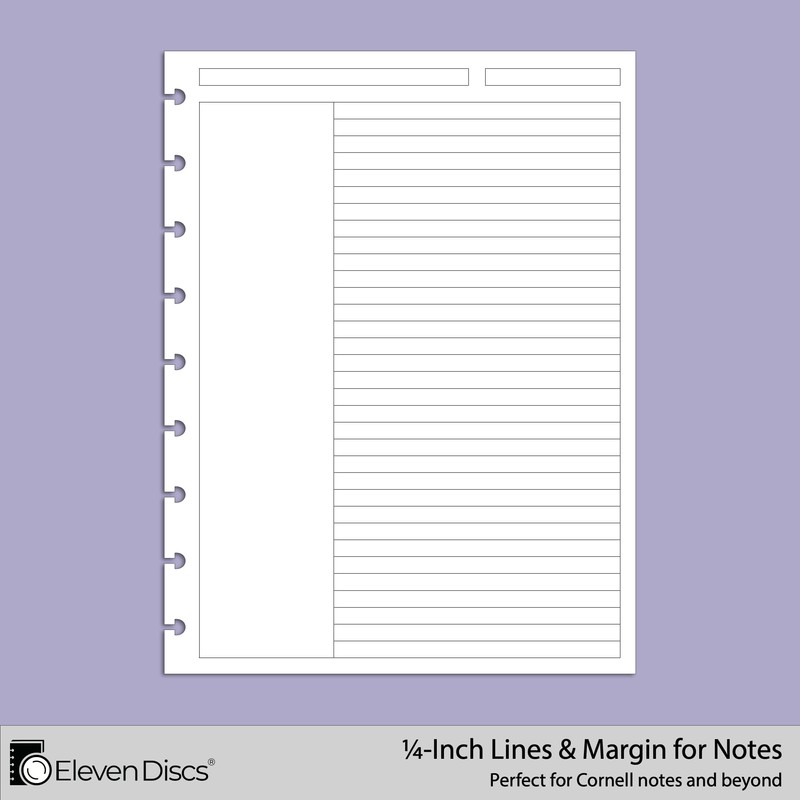 - MARGIN RULED – Useful for taking notes, whether in meetings, classes, or lectures. These are ruled notebook sheets that are great for Cornell notetaking method, allowing you to add keywords, questions, and information alongside your notes in the left-hand column.