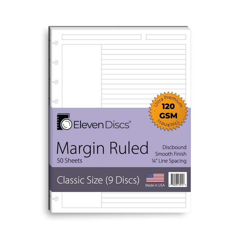 Classic Size Discbound Paper - Margin Ruled Sheets - Premium 120gsm Heavyweight Notebook & Planner Refills - 9 Discs, 7 x 9.25 in - Punched for Happy Planner (50 Sheets)