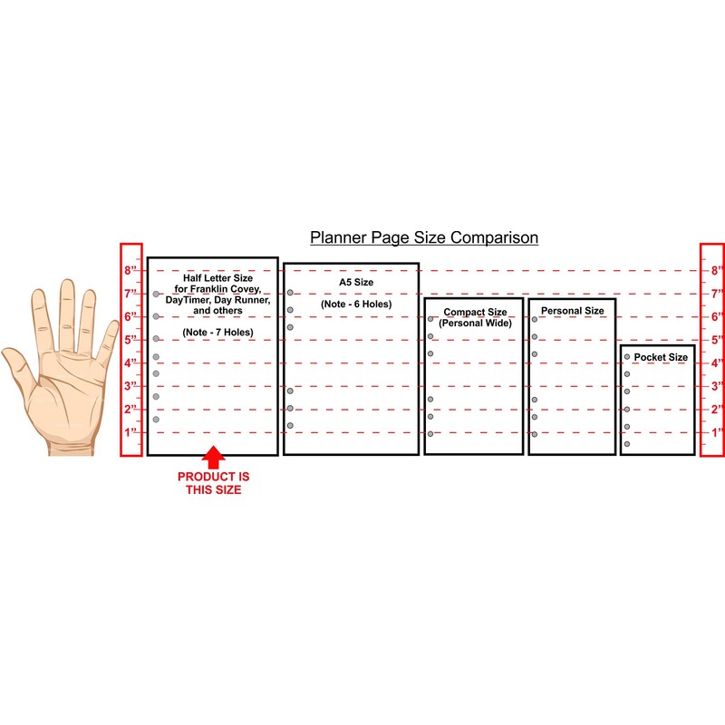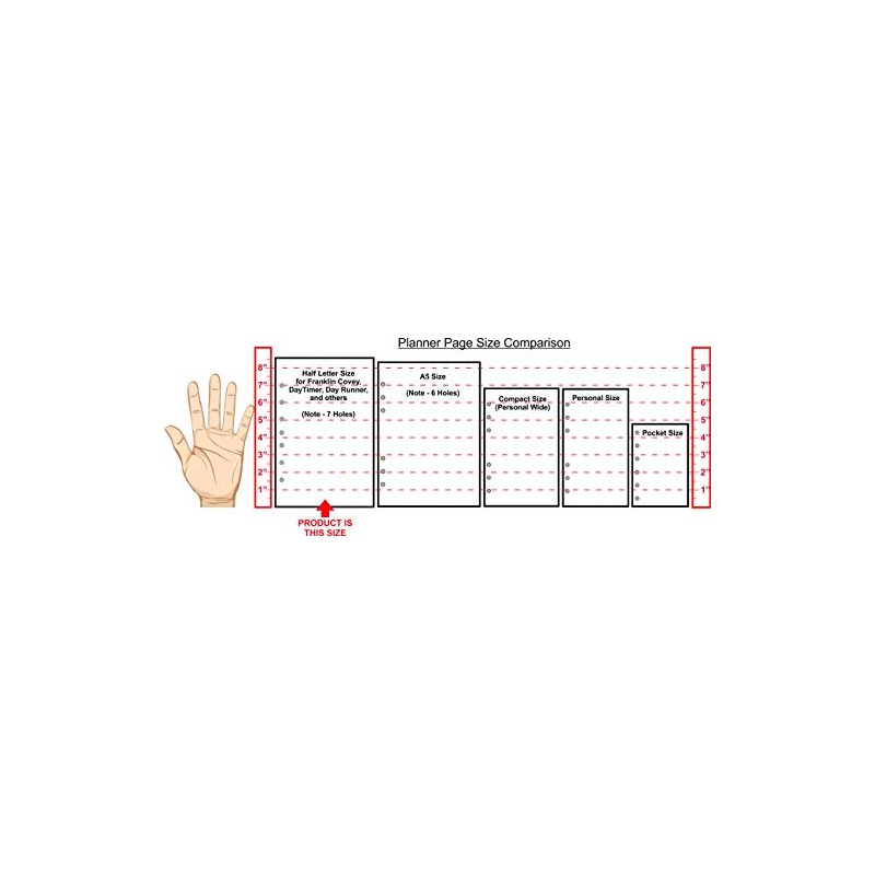 - Hole Punch Spacing: Punched with 7 holes spaced 1" - 1" - 3/4" - 3/4" - 1" - 1" to fit popular 7-ring organizer notebooks, such as Franklin, etc.