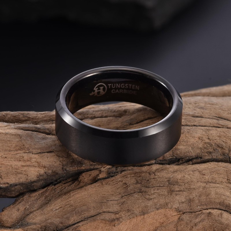 - *CLASSIC DESIGN - The 8mm wide black tungsten wedding bands finish with beveled edge and high polished comfort fit inner face, simple but generous, perfect for everyday wear.