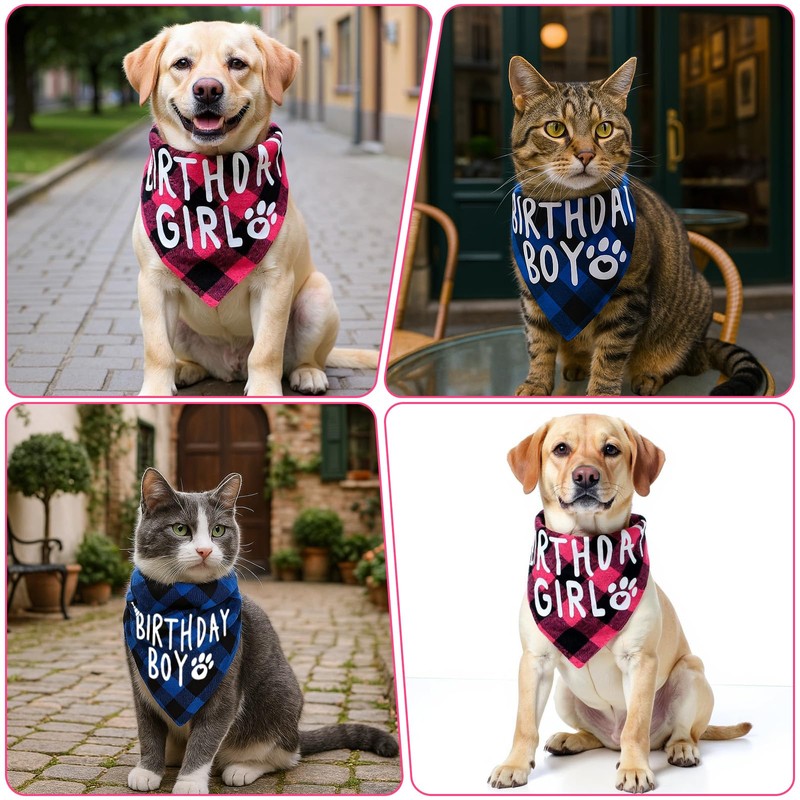 - 【 Included in the Package 】 It contains 2 pieces of bandanas for dogs. There are two colors to choose from. It adopts a classic check pattern design, which is fashionable and simple. The blue one is printed with the words "BIRTHDAY BOY", and the rose red dog birthday bandana girl is printed with the words "BIRTHDAY Girl", plus a cute dog paw printed. A style suitable for every kind of pet
