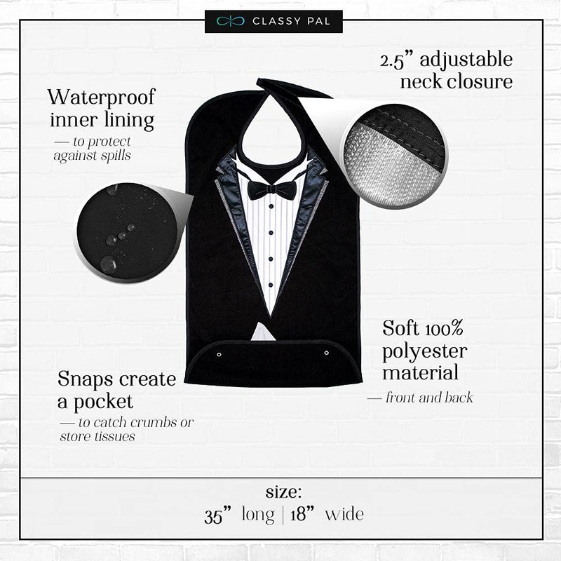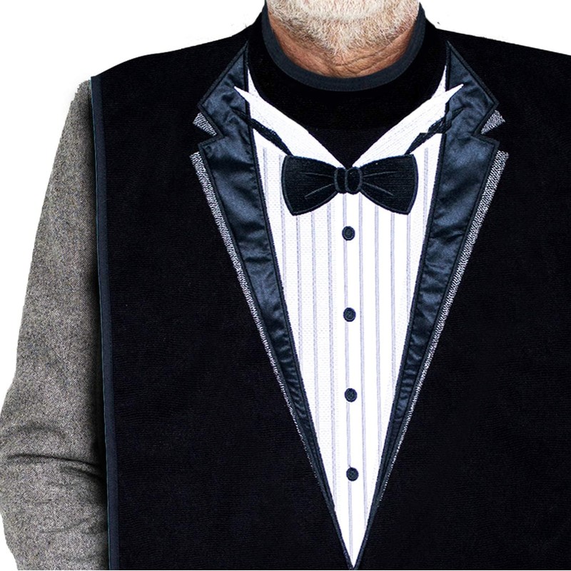 Classy Pal, Adult Bibs for Men, Dress ‘n Dine™ Clothing Protectors for Eating, Senior Adult Bib Terry Cloth Crumb Catcher, Embroidered Design, Waterproof, Reusable, Washable (Tuxedo)