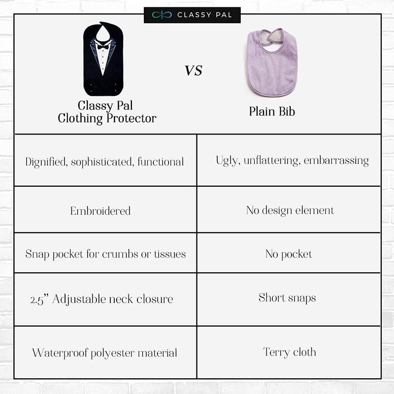 - The Gift of Happiness and Dignity - Celebrate yourself or a loved one with dignity, elegance, and style while dining at home or in a restaurant. Classy Pal Clothing Protectors are perfect to help keep clothes clean during mealtime (dining), applying makeup or on a commute to work. The Classy Pal adult bibs can easily be washed and reused many times over and over again.