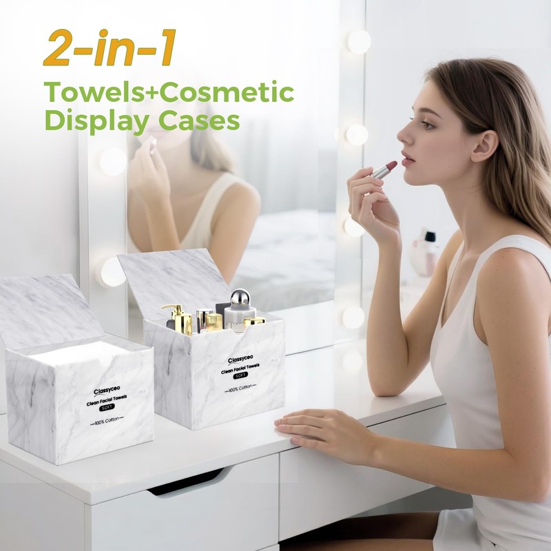 Classycoo Disposable Face Towel with Holder,100% Cotton Cleansing Towels for Sensitive-Skin, Odor-Free, Soft Makeup Remover Cloth Marble Organizer for Bathroom(Includes Facial Wipes)