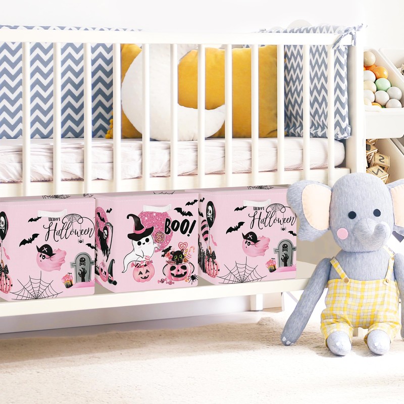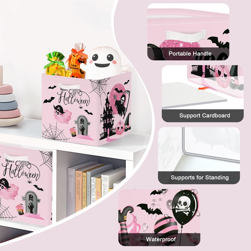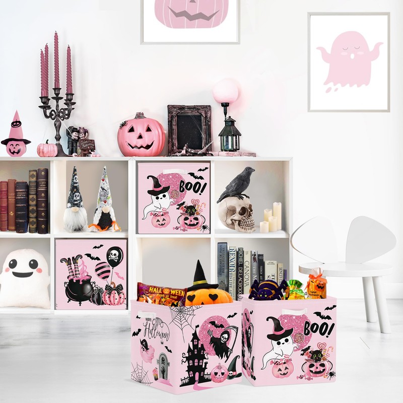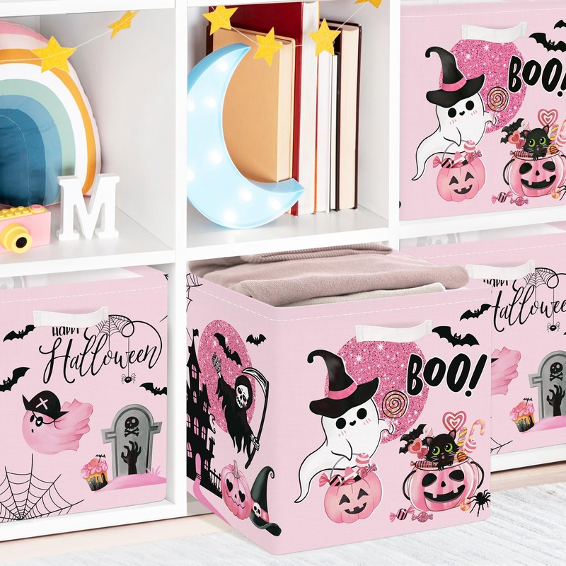 - Cube Organizer with Handle - It features with cute ghosts, pumpkins, witches, a spooky castle, bats, witch cauldron, and a pink glitter moon. Perfect for organizing toys and small items while adding a touch of Halloween charm to your home décor