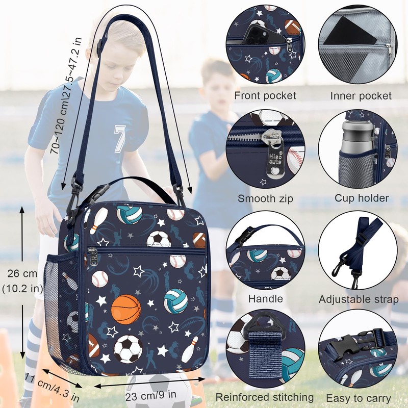 - ⚽ Large lunch bag children: bag size: 23 x 26 x 11 cm; belt size: 70-120 cm; up to 6.6 L (12 cans of cola); suitable for a variety of bento boxes, extra space for snacks, fruit, sandwiches and so on