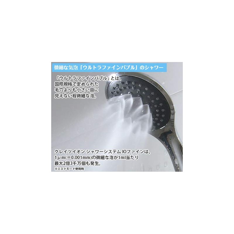 • Just change your shower head! Elevate your daily bath time without any construction. Nippon Television First Sale! Introducing the "Clay Tion Shower System" IO Fine, a convenient shower head that can be easily used by the popular "Ultra Fine Bubble" now. Ultra Fine Bubble is a microscopic foam that is smaller than the pores set by international standards. The Clay Tion Shower System IO Fine produces up to 230 million pieces per 1 ml of fine bubbles (= 0.001 mm) Micro foam gently washes away without rubbing