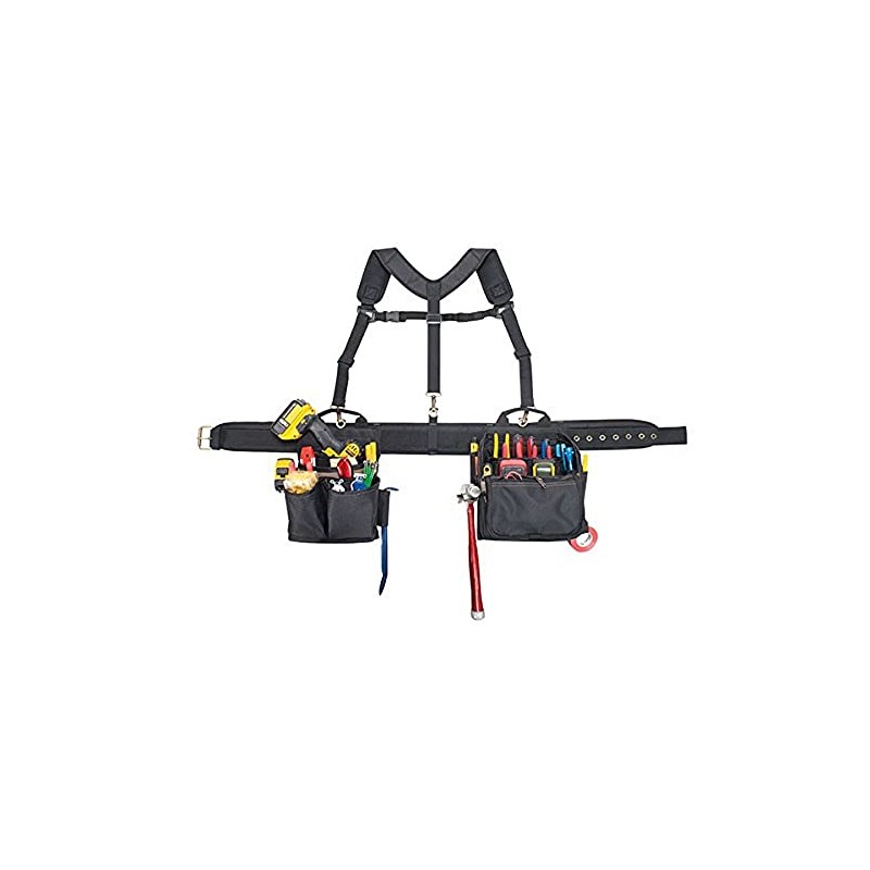 This professional quality 4-piece electrician’s combo rig tool belt has 28 pockets and comes with a 3" padded, single-tongue roller buckle belt, padded 4-point suspenders, a cordless drill pocket, all to organize your favorite parts, connectors and tools.