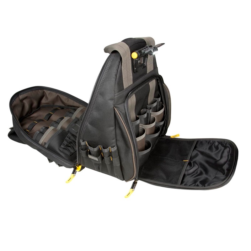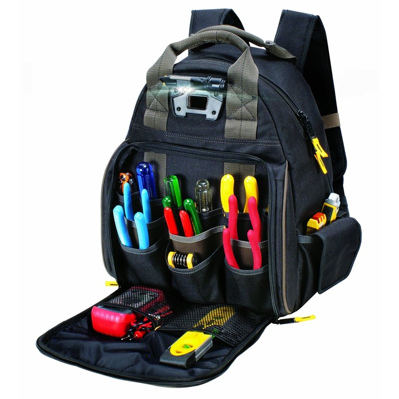 - BUILT-IN LED LIGHT: The built in LED light on this lighted tool backpack can be easily directed at work area or into tool carrier to help identify tools and parts. 3 Levels of light output allow adjustment for wide area illumination or close-up work.