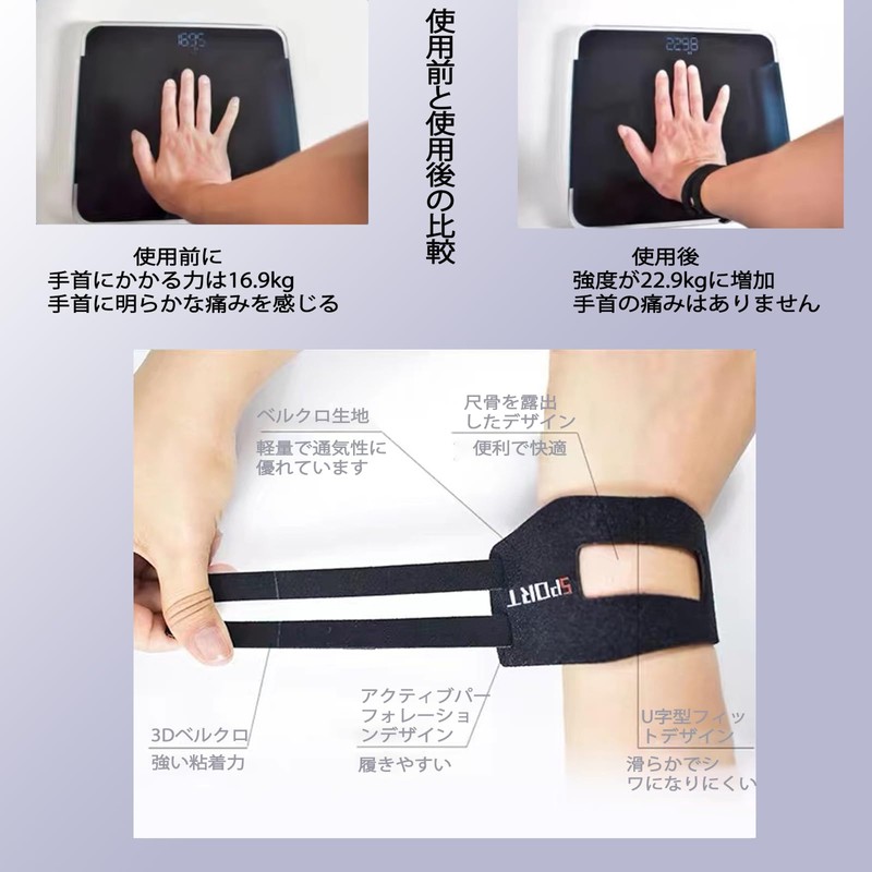 - (High Quality Materials) This product uses OK fabric (95% nylon, 5% urethane, made in Japan). Soft and breathable, the wrist protection will not change when you are exercising or sweating. The surface of the cloth is smooth and wrinkle free, preventing wrist pain when using. In addition, it has a sticky adhesive that prevents the Velcro tape from coming off