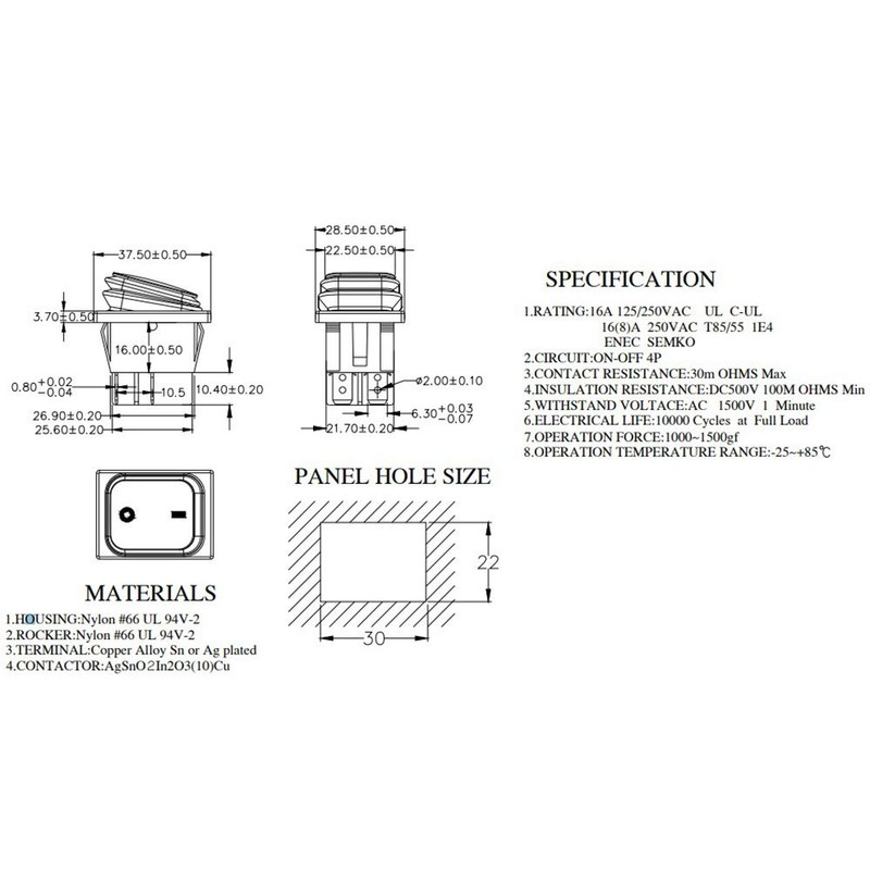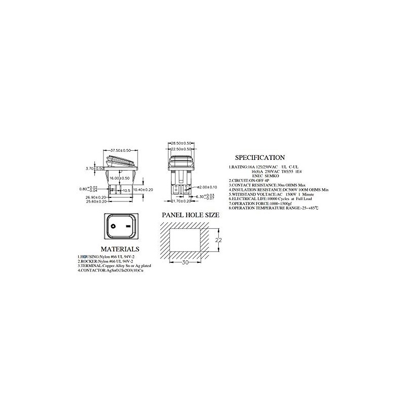 - Position: On Off; Lamp Color: Green; Rated Voltage: AC 16A 250V, AC 20A 125V; Total Size: 37 x 28 x 40mm