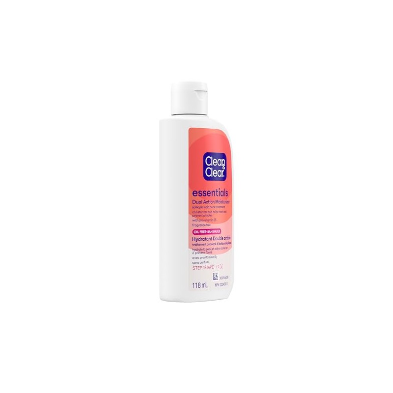 Clean and Clear Essentials Dual Action Moisturizer treats and prevents pimples while moisturizing skin. This moisturizer is ideal for all skin types. Designed to give you clearer, healthier-looking skin without overdrying, the lotion contains salicylic acid acne medicine to target the pimples you have now, while preventing new breakouts from forming. Step three in the CLEAN and CLEAR ESSENTIALS regimen this moisturizer is oil-free and suitable for everyday use. This face moisturizer comes in a 118-millilitre pump bottle.