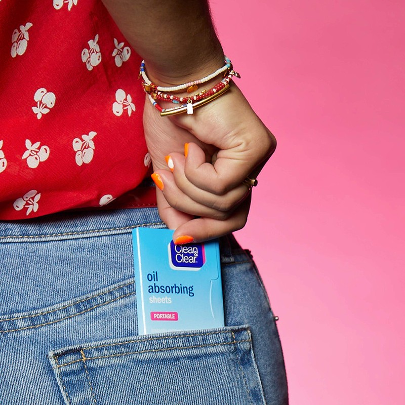 - 50-count package of Clean & Clear Oil Absorbing Facial Blotting Sheets to soak up excess oil and remove shine