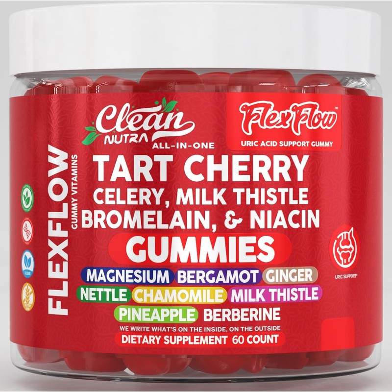Clean Nutra FlexFlow Tart Cherry Gummies, Uric Acid Support Supplement with Milk Thistle and Bromelain, 60 Count