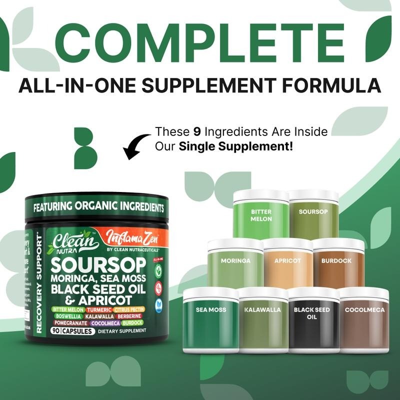 Clean Nutra InflamaZen Capsules – Soursop, Sea Moss, Moringa & Black Seed Oil for Inflammation Support and Recovery