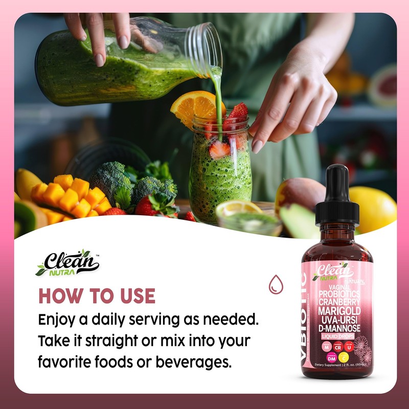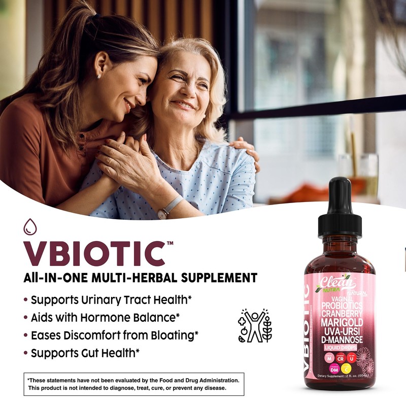Clean Nutraceuticals Clean Nutraceuticals VBiotic Vaginal Probiotic for Women Liquid Drops | Cranberry Uva Ursi Horsetail D-Mannose Prebiotics Marigold & Black Cohosh Vaginal Health Supplement | pH Balance