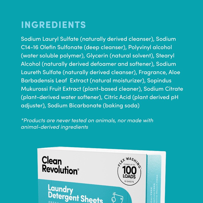 - NEW FLEX WASHING DETERGENT SHEETS: Regular laundry detergent is often 90% water, and if you over pour it can damage clothes and irritate skin. Clean Revolution Laundry Detergent Sheets are perforated and easily tears in half for lighter laundry loads.