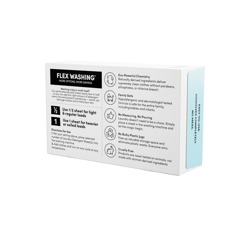 - 1/2 SHEET FOR LIGHT LOADS OR 1 LAUNDRY SHEET FOR HEAVY SOILED LOADS: Ditch the plastic and waste, 100% recyclable box of waste-free, completely dissolving detergent sheets with Fresh Linen scent