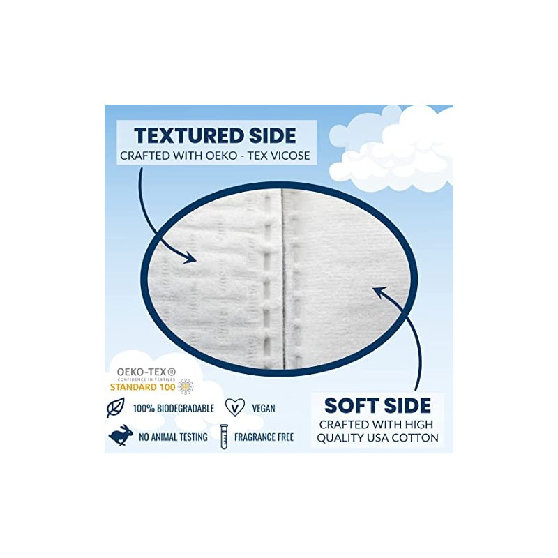 - ◽ Gently slough away buildup: Textured and high-density OEKO-TEX viscose fabric helps lift makeup, dirt, and oils.