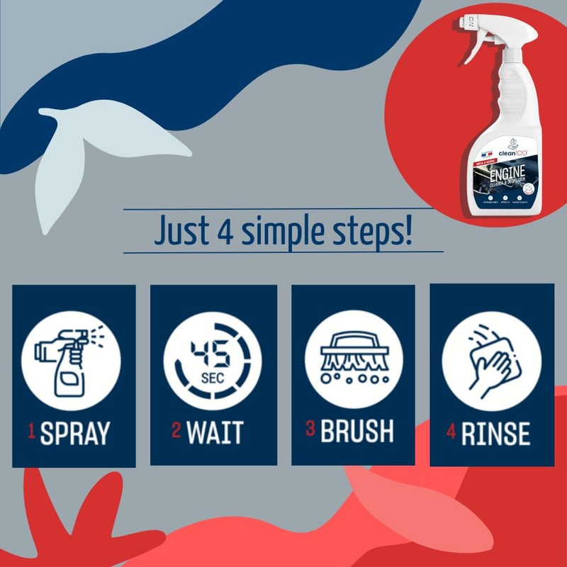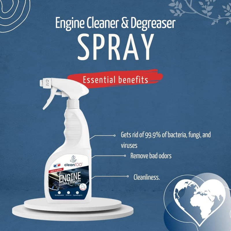 - EASY TO USE: It comes in a vegan bottle spray, simply spray the clean100 natural cleaner directly onto the engine parts, gently agitate with a clean brush, or scrubber, and wipe away the grease. Its convenient spray bottle allows for precise application in even hard-to-reach engine parts.