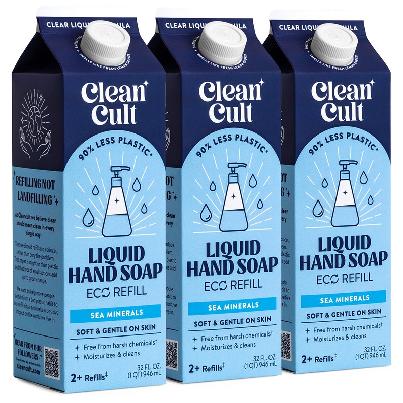 Cleancult Liquid Hand Soap Refills (32oz, 3 Pack) - Hand Soap that Nourishes & Moisturizes - Liquid Soap Free of Harsh Chemicals - Paper Based Eco Refill, Uses 90% Less Plastic - Sea Minerals