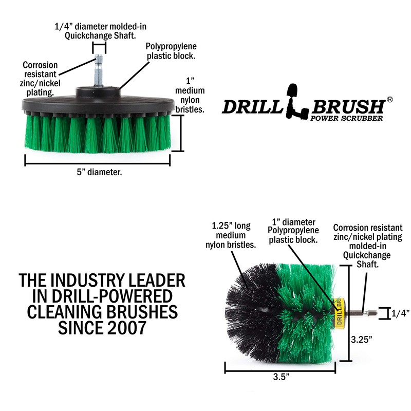 Both brushes are medium stiffness for all purpose cleaning of kitchen surfaces. These brushes should cut your kitchen cleaning and scrubbing time in half (or more) compared to the rigorous effort involved in hand scrubbing. These spin brushes also do a better job of restoring, and then maintaining your kitchen surfaces. Always look for the “Drillbrush Power Scrubber” logo to insure you are buying an authentic Drillbrush from the leader in drill powered cleaning brushes. Drill is NOT included.