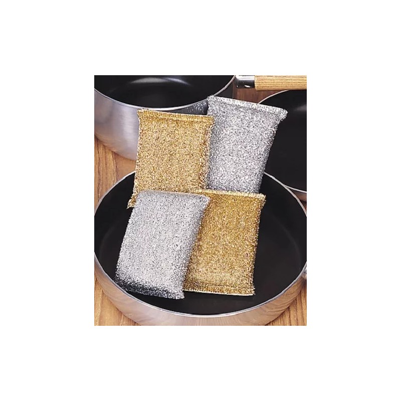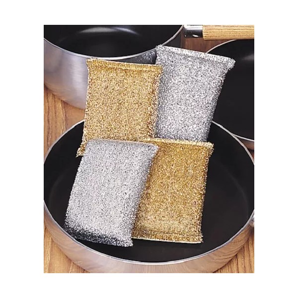 Remove the food particles - not the finish! This all-purpose scouring pad is made from a metallic polyester over a thick, absorbent sponge. Just as effective as steel wool, yet it's completely safe on Teflon®-coated cookware and other nonstick surfaces. Lifts burnt-on, baked-on messes... and polishes pots and pans to a brilliant sheen. Long-lasting, just rinse for repeated use. You'll receive two gold and two silver, each about 5"L x 3½"W x 1¼"H.