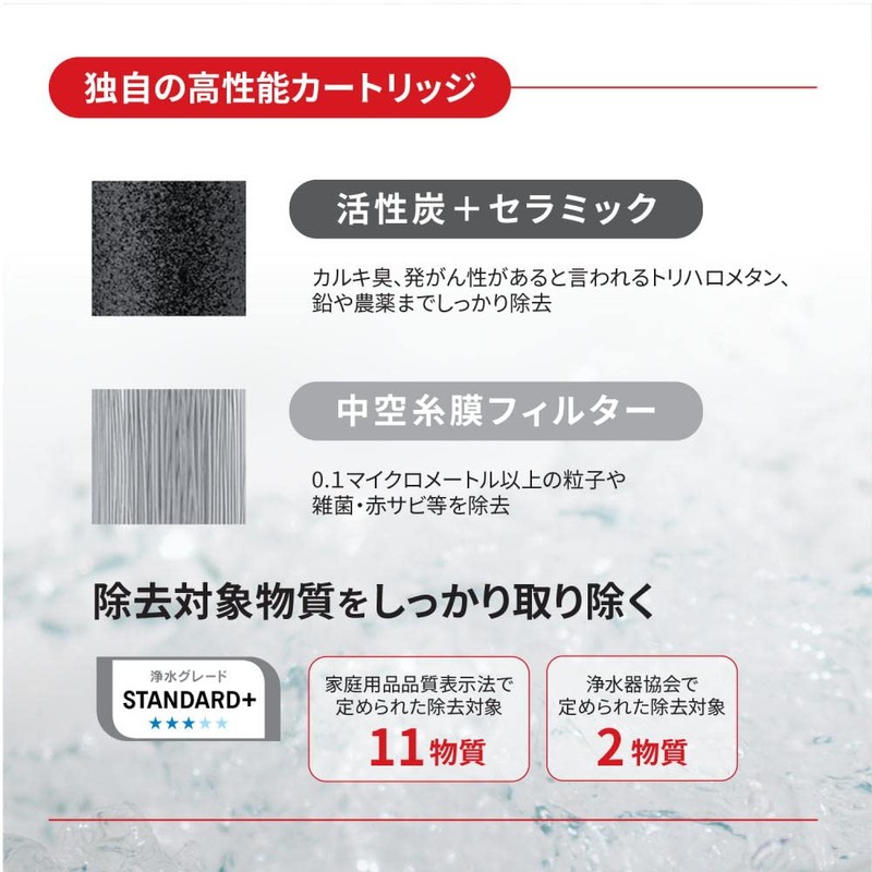 - (Highly Removes 11 + 2 Substances) Highly removes 11 of the target substances determined by the JIS S 3201 household water filter test method, and 2 of the removal substances determined by the Water Filter Association. It also removes trhalomethanes that are concerned about