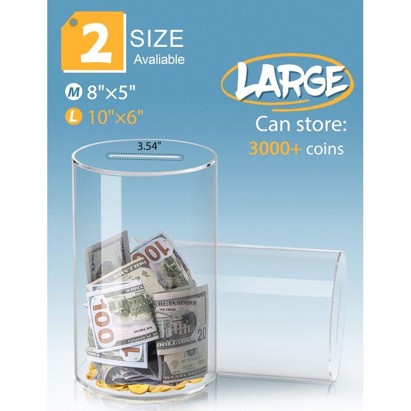 - Transparent Design: The acrylic piggy bank is made of transparent acrylic and allows kids and adults to easily watch savings grow, giving motivation to keep adding to it. Fun way to save money and keep all your spare change