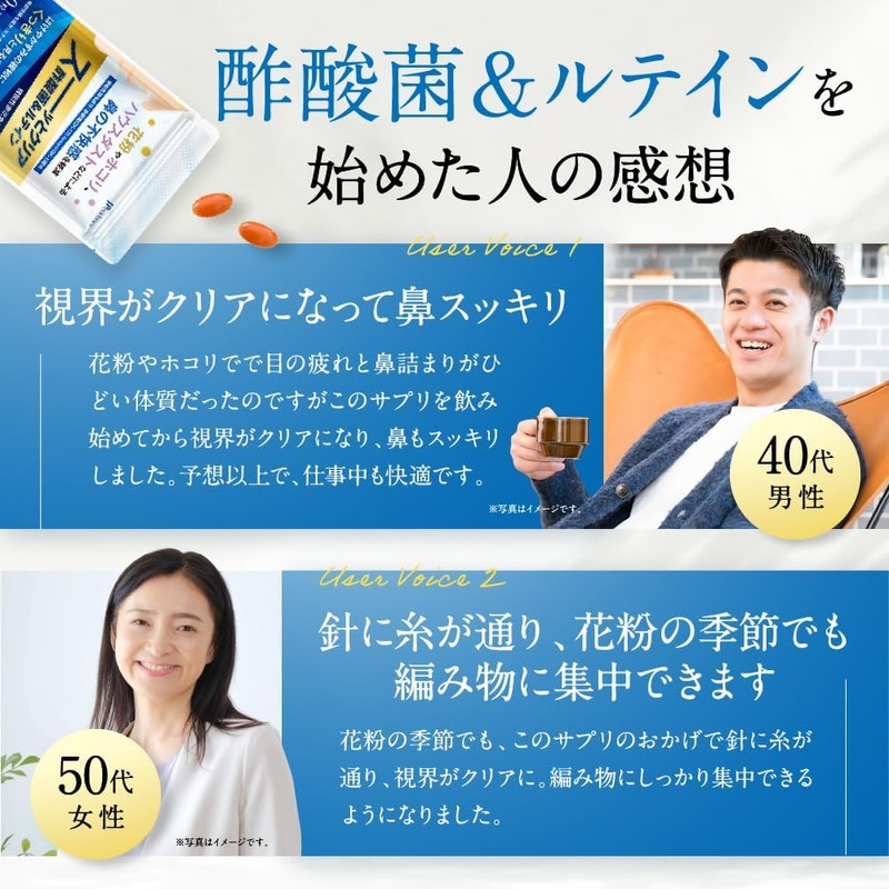 Clear and refreshing Acetic acid bacteria & Lutein Reduces nasal discomfort caused by pollen, dust, house dust, etc. Improves clear vision by reducing blurring and haze Lutein Zeaxanthin Functional food