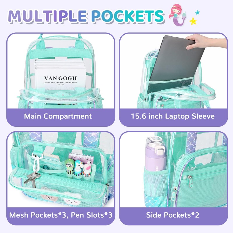- MULTIPLE POCKETS: Dimension: 15.55" H x 5.9" W x 11.8" L; Weight:1.54 lb; Large main compartment with laptop sleeve is perfect for child school supplies, it fits up to 15.6 inch laptop and is spacious enough to fit binders, A4 folders, tablet, books; The quick access front pockets with slip pockets x 3, pen pockets x 3, storing your small stuffs. This see through bookbag with exquisite pattern could meet children needs of a perfect clear back pack