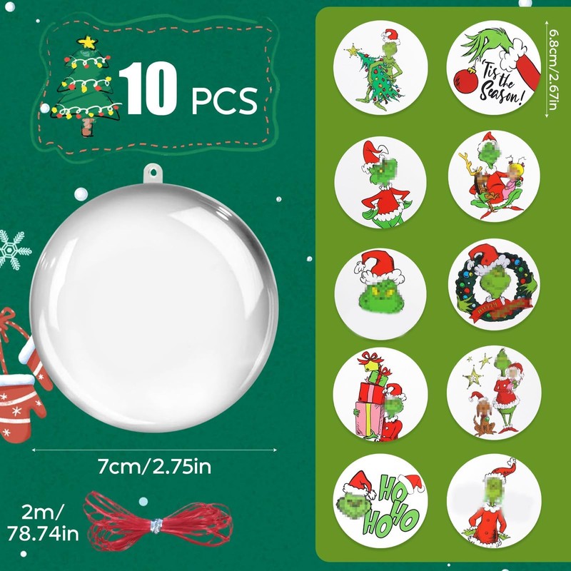 - 【PRODUCT INCLUDES】: 10 x 7 cm plastic fillable Christmas baubles, 10 x double-sided printed Christmas cards, 2 m red rope.