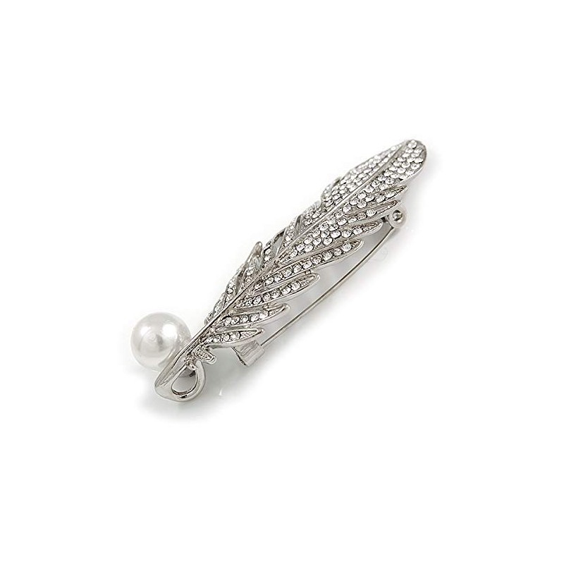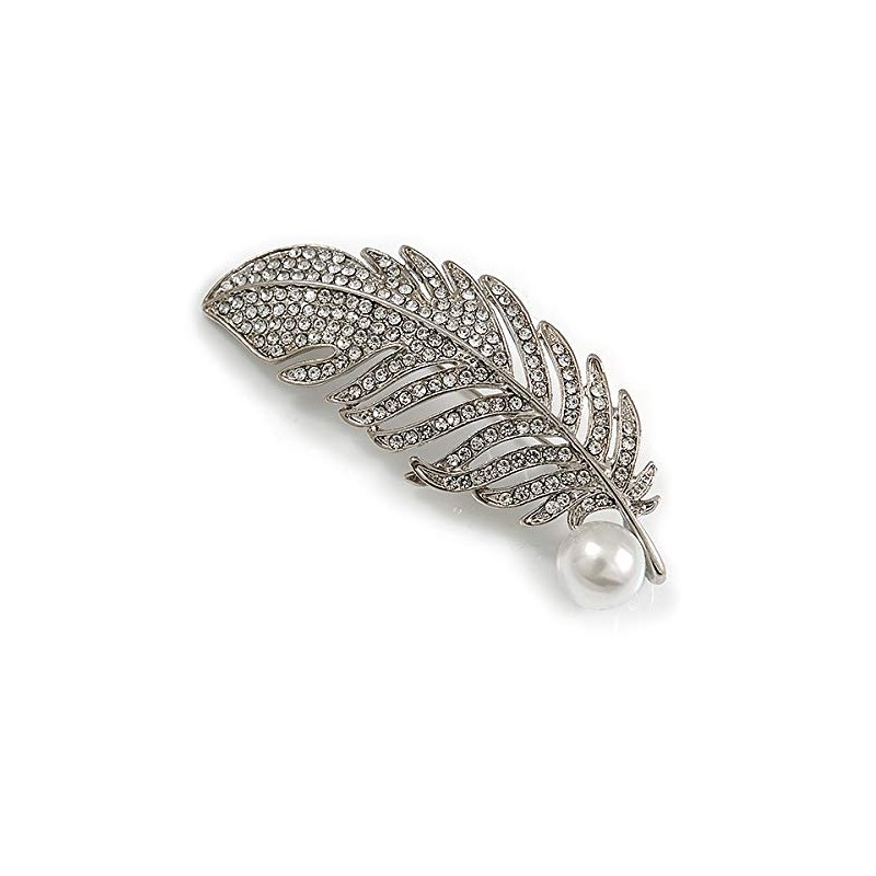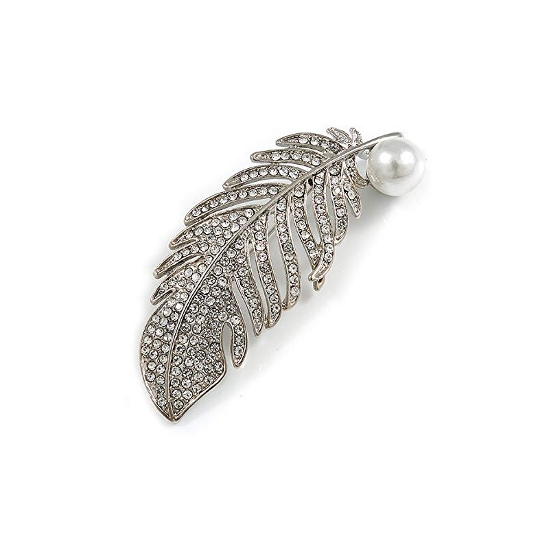 Clear Crystal White Pearl Feather Brooch/Pendant In Silver Tone - 65mm Long