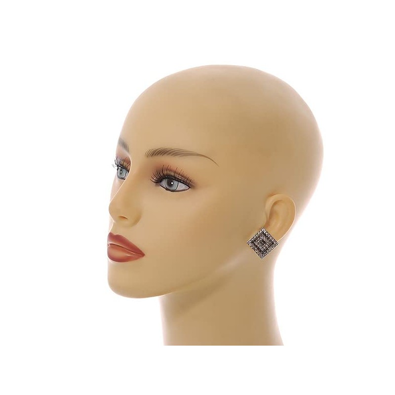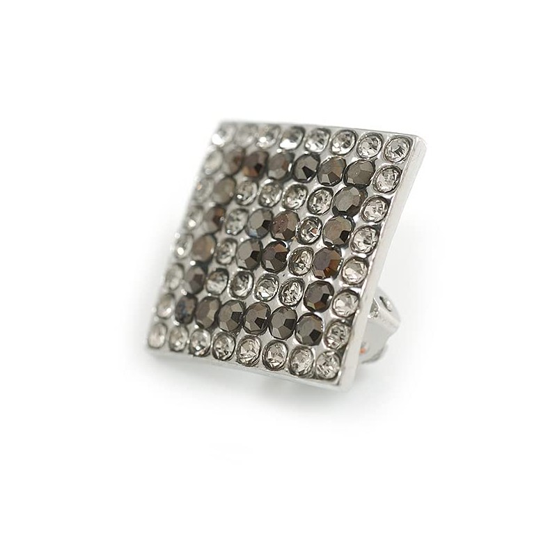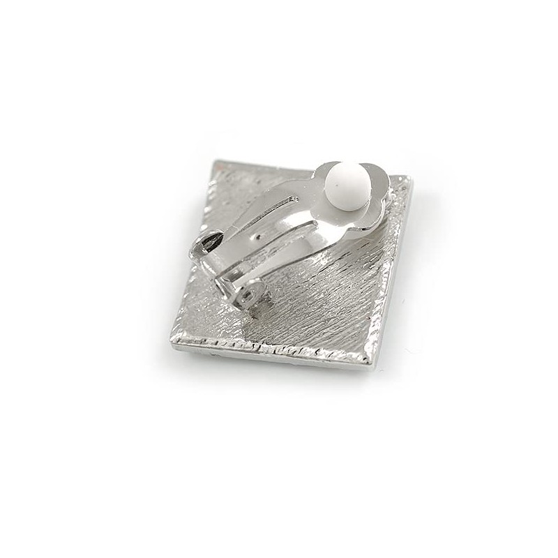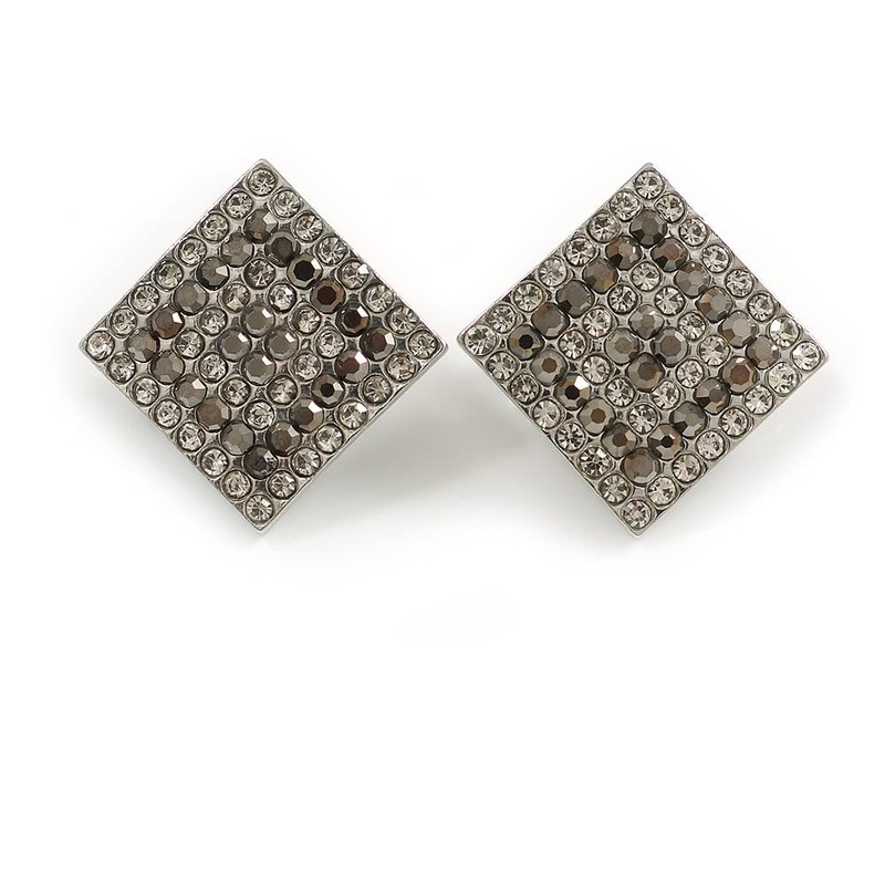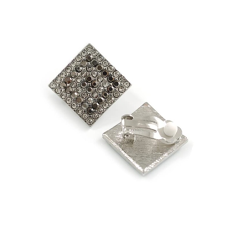 Clear/Dark Grey Crystal Square Clip-On Earrings in Silver Tone - 18mm Tall