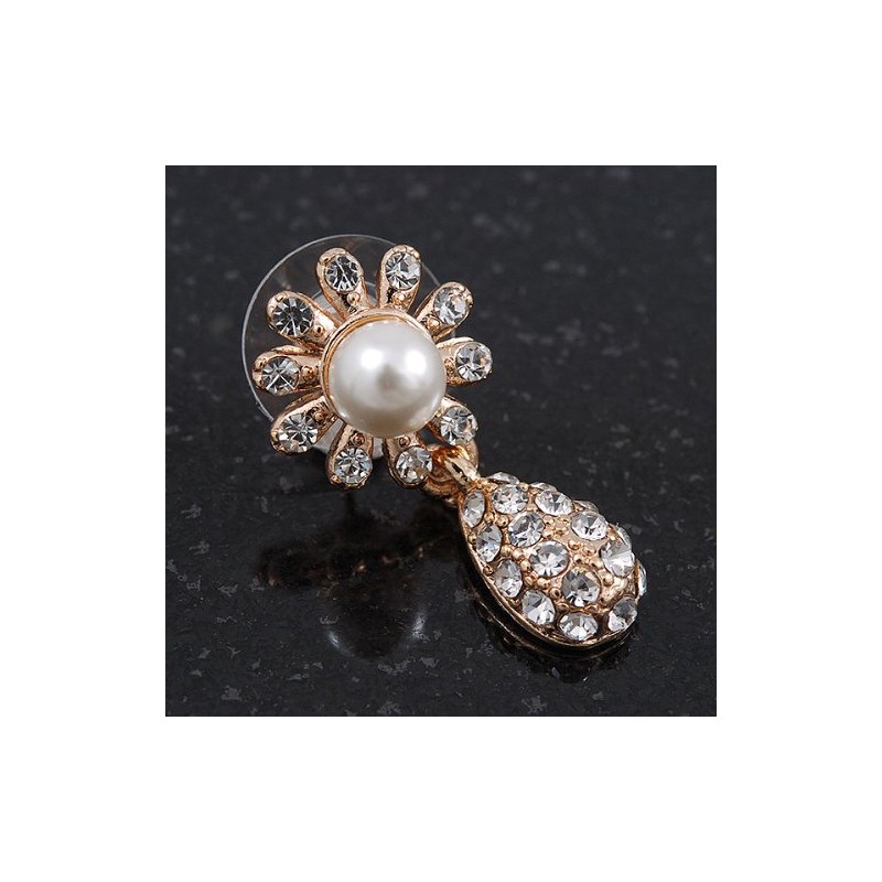 Clear Diamante Simulated Pearl 'Flower' Drop Earrings In Gold Plating - 2cm Length