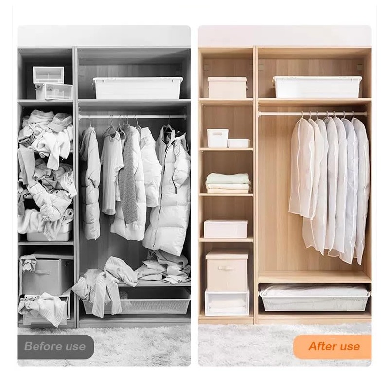 - Various Uses:Covers for closet perfect fit both men’s and women’s apparel,ideal length for shirts,top,suit cover,tuxedo,bridal gown,dance costumes,sweaters,fur,jackets,trousers,long winter coats etc,great closet clothing storage organizer