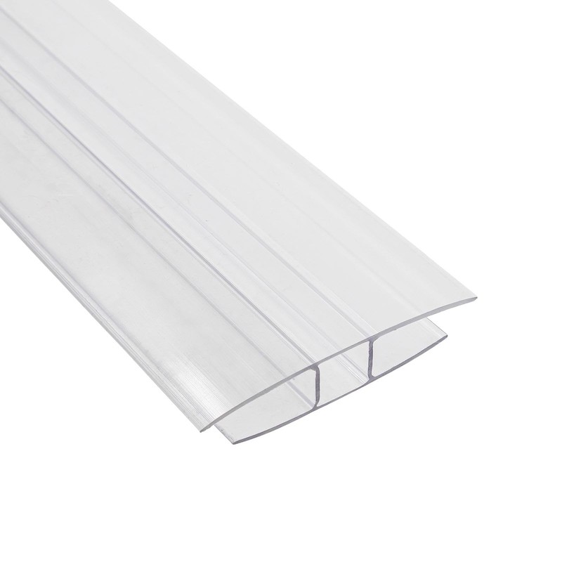 Clear, 1.9m long H-profile joining strip, for seamless connections between polycarbonate sheets. Fits quickly and easily without any special tools. Suitable for 6mm, 10mm, and 16mm sheets, end-on-end, or side-to-side, in roofing and cladding projects.