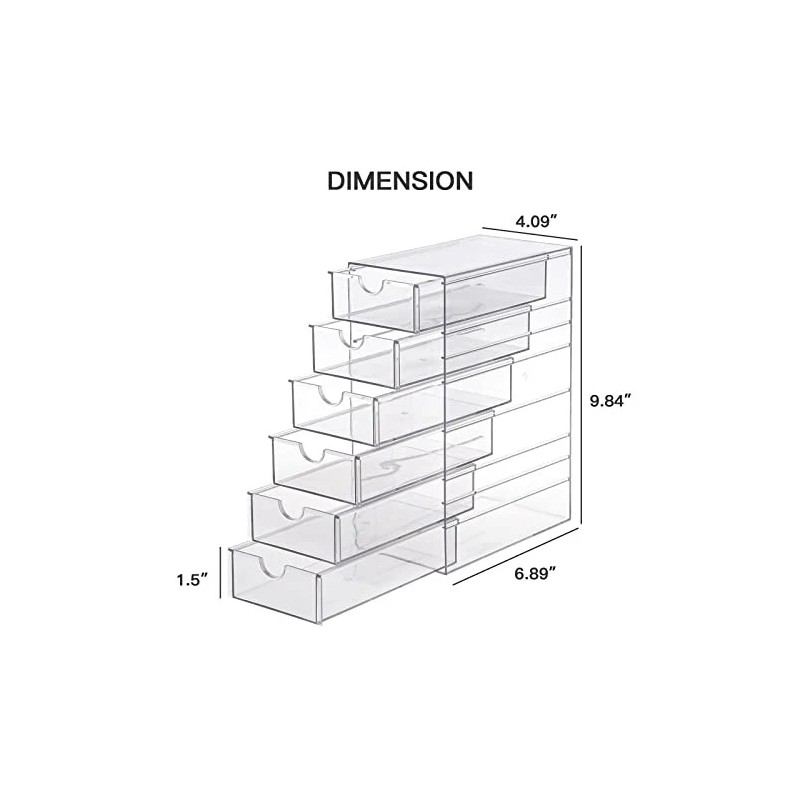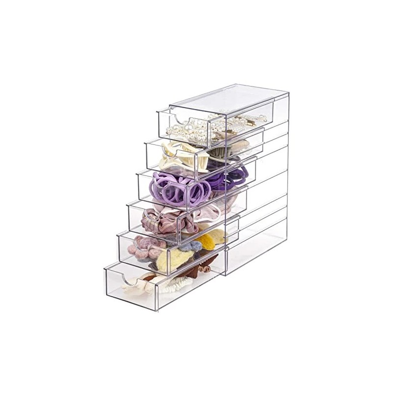 Clear Hair Accessory Organizer Box with 6 Drawers, Compact Storage Organization Drawers Set for Cosmetics, Glasses, Stationery, Stackable Storage Containers Box for Bathroom, Closet, Office
