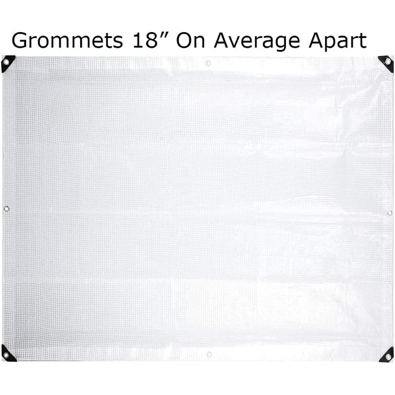 Premium 8' x 12' Clear heavy-duty tarps- 3 x3 Polyester Mesh, 14 Mil Thickness, 6 oz per square yard, grommets every 18 inches with rope reinforced edges and plastic corners for extra strength. All of our 8' x 12' clear heavy-duty tarps are great for all weather providing 3% Treated UV Protection.