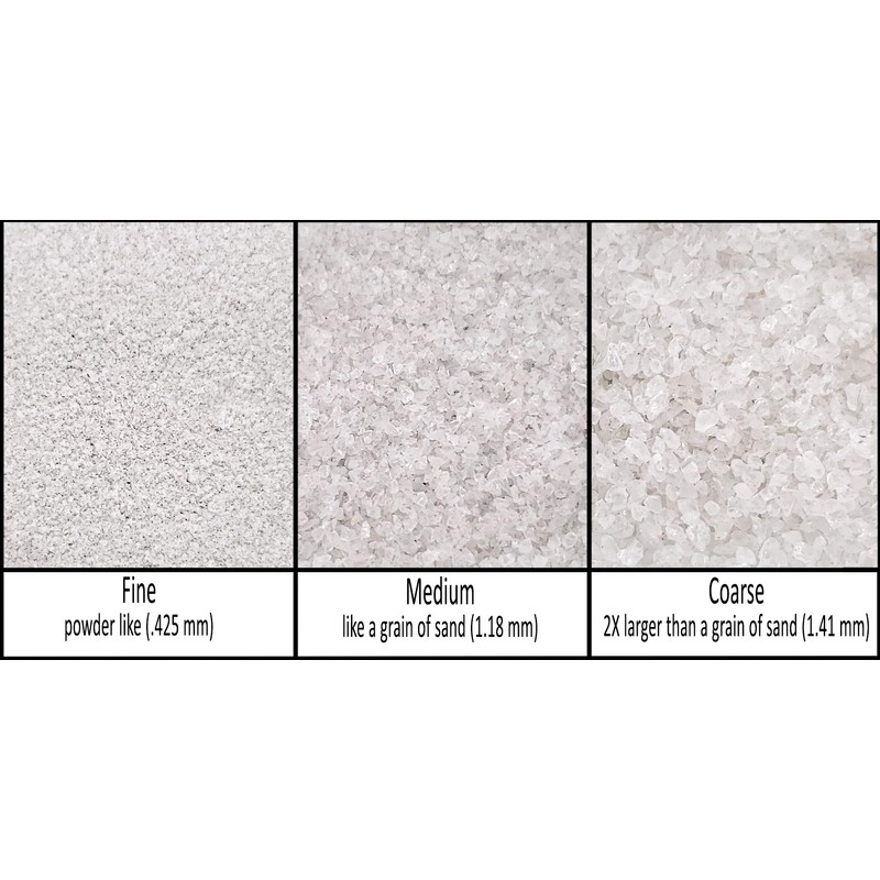 Size options available: ½ oz (14 gr), 1 oz (28 gr), 2 oz (57 gr) Consistency Options: Fine is like powder (.425 mm), medium is like a grain of sand (1.18 mm), and course is 2 times bigger than a grain of sand (1.41 mm). - Due to the different monitor and light effect, the actual color of the item might be slightly different from the color shown on the pictures.
