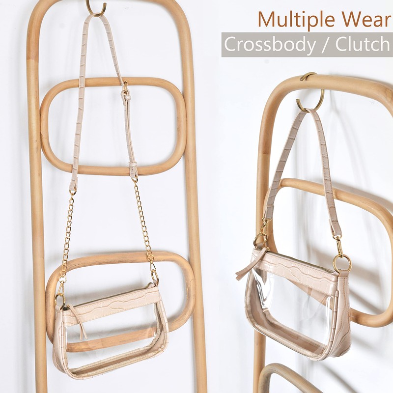 - This clear bag come with two differents length Strap,use short strap to slung effortlessly over the shoulder or simply holding it on your arm! the detachable long strap(adjustable up to 49''lenght) lets you wear the bag as a crossbody for multiple hands-free wear options.