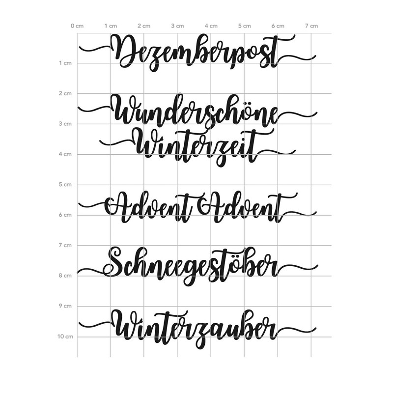 Calligraphic sayings for Christmas: December post, beautiful Christmas time, Advent Advent, snow flurry, winter magic. Width: 7 cm each.
