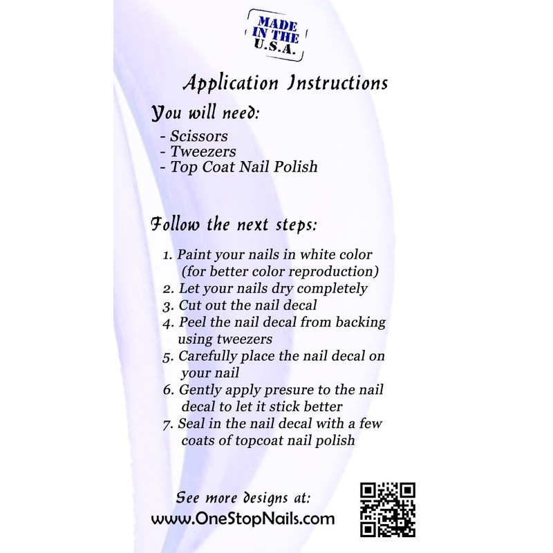 - Set is printed on a 2.9"x4.9" sheet of clear (transparent) vinyl. Decals are not die cut, to be cut to fit the size and shape of the nail better. Average sizes of decals are from 0.2" to 0.4". NOT for XXL size nails!