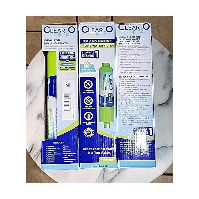 The Clear2O CRV2006 RV and Marine Inline Water Filter is a pack of 3 filters suitable for commercial and household use. It is designed in green color with ceramic and plastic materials, utilizing a carbon block filtration method to remove chlorine taste & odor. Ideal for RVs and marine settings, this water filter ensures clean and refreshing water for various applications.