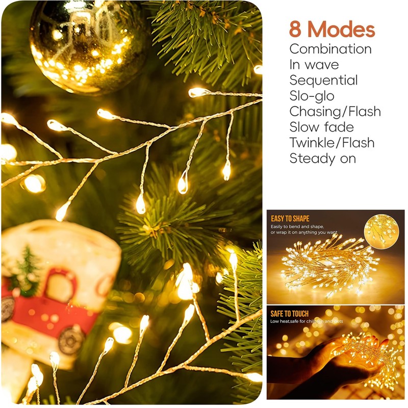 Clearhill 2Pack USB Fairy Lights with Remote Control, 20ft/6M 200LED Warm Firecracker Cluster Lights, 8 Modes, Waterproof Copper Wire String Lights for Bedroom, Wedding, DIY, Garden Decor