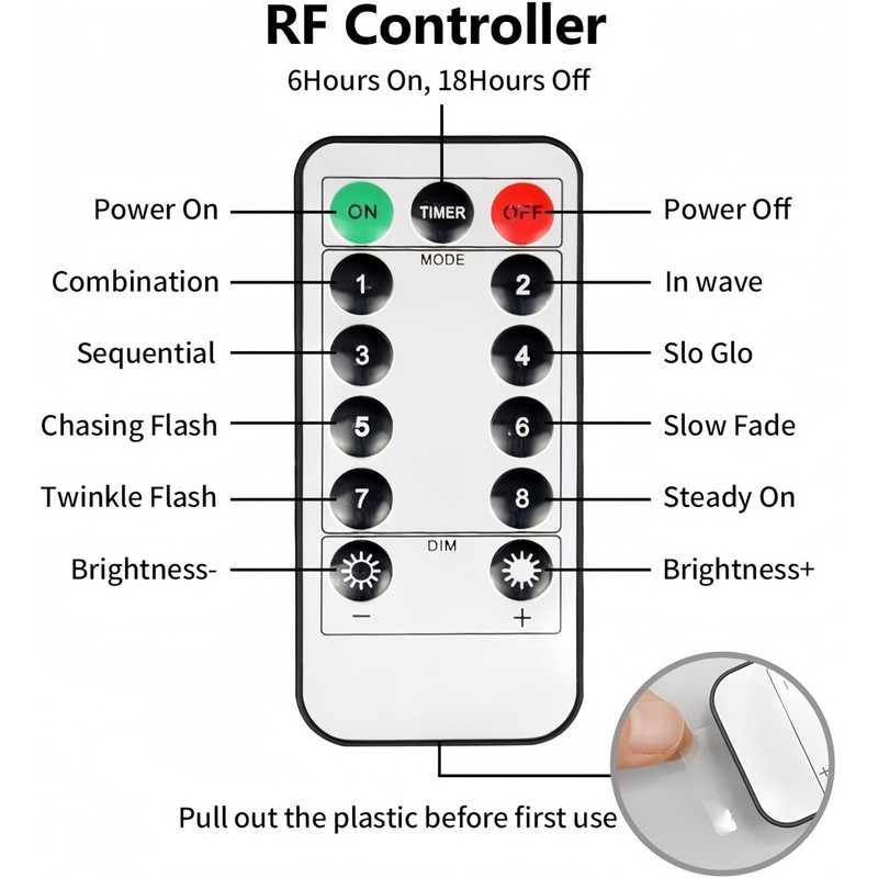 - Convenient Remote Control & Timer Function: Effortlessly customize your lighting experience with the included remote control. With a simple press, activate the timer to keep the lights on for 6 hours and automatically turn them off for 18 hours. This energy-saving feature ensures your lights are always perfectly timed to enhance your space, whether indoors or outdoors, without the need for constant manual operation.