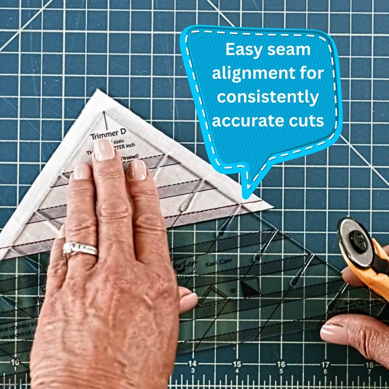 - One alignment. Two Cuts = trims all four sides of half-square triangles. Makes cutting quilt pieces go faster.