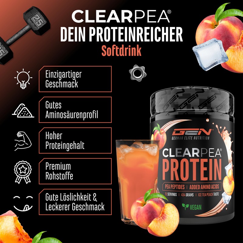 - PREMIUM ROHSTOFF: Mit unserem patentierten hydrolysierten Erbsenprotein setzt ClearPea neue Maßstäbe für pflanzliche Proteine. 100 % vegan, technologisch überlegen und nachhaltig gewonnen, überzeugt es mit einem glasklaren Finish, ganz ohne den typischen sandigen Nachgeschmack. Dank revolutionärer Technologie bietet es höchste Qualität und Genuss.