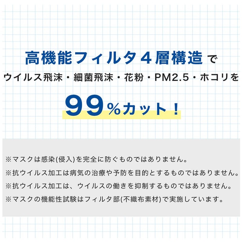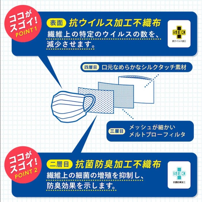 4-layer construction for protection against virus spraying, bacteria, pollen, PM2.5, dust, etc.; Product information: Adopts anti-virus treatment, antibacterial and odor-resistant non-woven fabric (SEK mark certified), which reduces the number of viruses attached to the mask surface and inhibits bacterial growth. 4-layer construction blocks viruses, bacteria, pollen, PM2.5, dust and fogging prevention parts to block fogging glasses. Uses double wire for nose fit wire and center wire. Soft round elastic cord prevents ear pain. Hygienic and easy to carry. Note: This product is a simple mask, so please do not use in places where harmful dust or toxic gases may occur. Discontinue use immediately and consult a physician if symptoms such as itchy, rash, or rash. If you feel uncomfortable due to the smell, please stop using it. Please be careful when driving. Please note that if the ear strap is pulled too much, it may break. This is a long-time product. Not reusable after washing. Do not use near fire. For hygiene and functionality, we recommend using one piece per day. Please do not put the mask back once used. The antiviral effect of this product reduces the number of specific viruses attached to the first layer of non-woven fabric from the outside. The antimicrobial effect of this product inhibits the growth of bacteria adhered to the second layer non-woven fabric from the outside. [Storage and Handling Precautions] Store in a clean place without moisture. Keep out of reach of infants. Please close the outer bag and store it in a clean place. Do not store in hot and humid places, direct sunlight. This may cause discoloration.